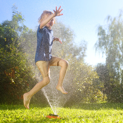 Set up the lawn sprinkler and create challenges to get small children excited about running through the water. Be aware that this cold water on warm skin can be a jolt. You may have to walk them through it slowly to start.