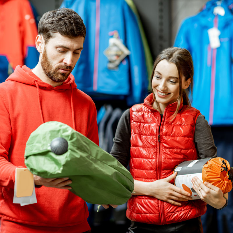 Choosing sports equipment and looking an the sleeping bags and tent prices for their next outting.