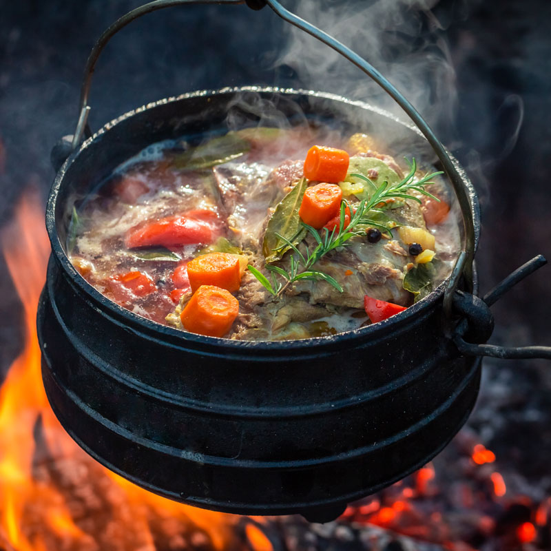 Tasty and spicy hunter’s stew on bonfire