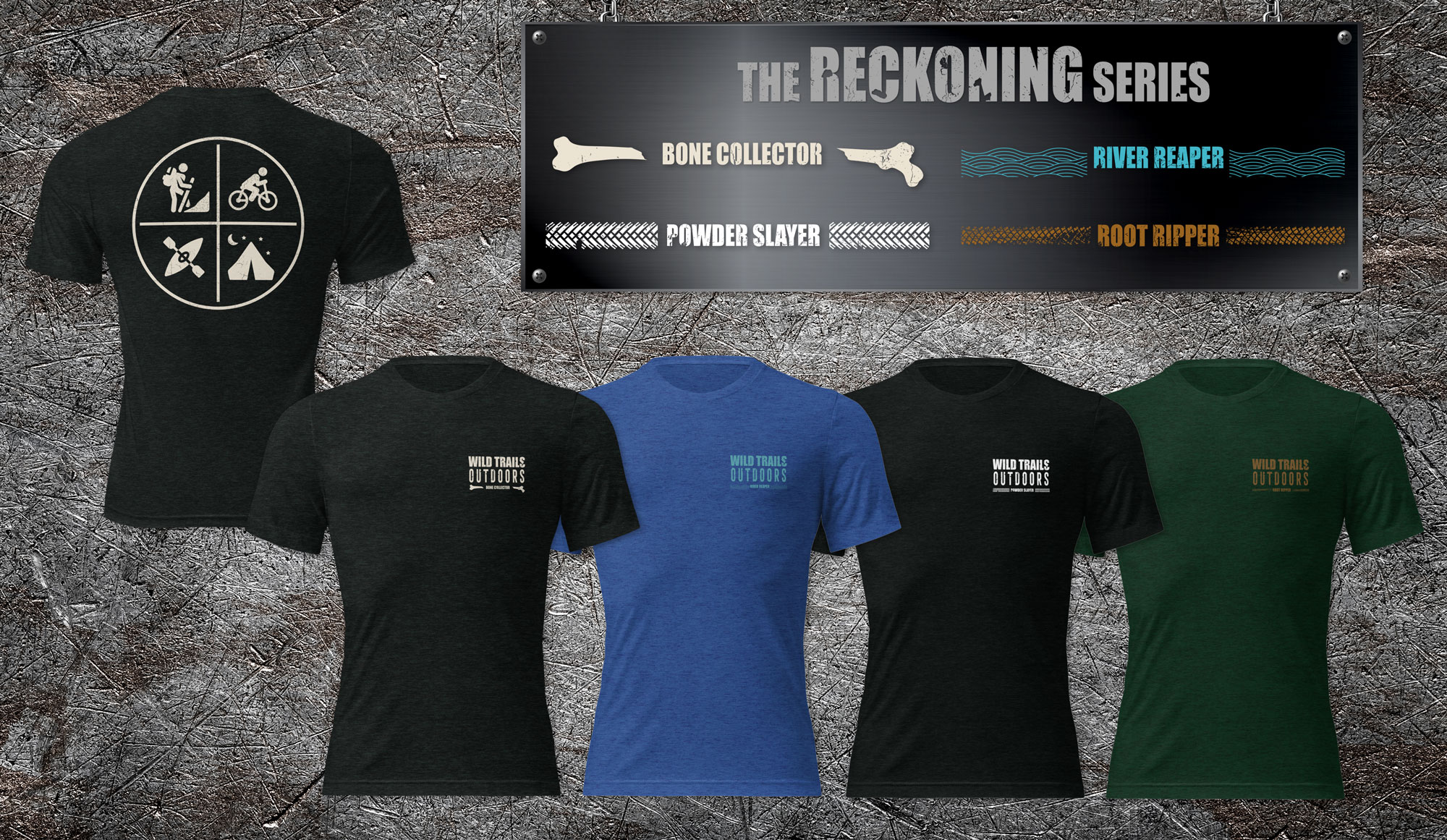 Each design tells its own story, from the Bone Collector who rises after every fall, to the Root Ripper who tears through the earth with unstoppable force, to the Powder Slayer who conquers silence and snow, to the River Reaper who claims calm from the storm. This is your reminder that adventure has a cost, and every scar, every scrape, every mile is proof that you paid it in full.