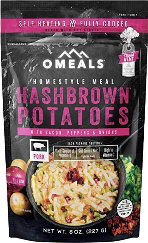 OMEALS Hashbrowns Potatoes with Bacon, Onions, and Peppers. Smoked bacon, skillet-tossed potatoes, and sauteed bell peppers and onions make for a delicious, easy meal. Premium flavor that is sure to be a hit for the family every time, anywhere!