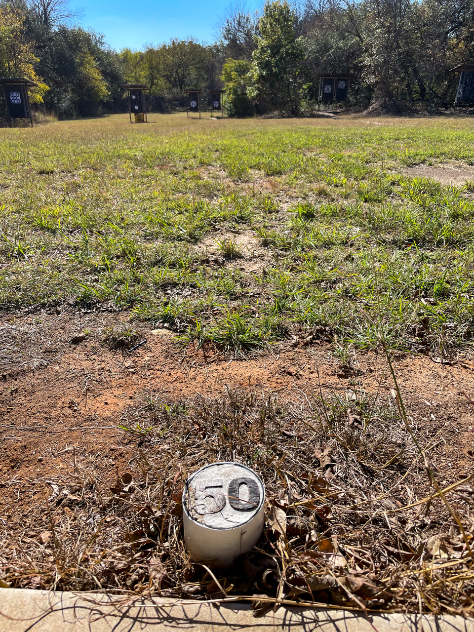 Target archery ranges are set up with foam target bails and are set up at fixed distances varying from 10yds to 100yds. Paper targets are then pinned to these bails. A session will be on a single target at a predetermined distance. Traditionally, the recurve bow was used, but, in recent times, scoring has been added for compound bows. Targets have colored rings (gold, red, blue, black, and white), and each ring is worth a specific point value from 1 to 10 for recurves and 7 to 10 for compounds. The 10 ring also has a smaller inner circle with an X in the center. There is no point value for the X, but Xs are used to break a tie. Recurve targets have one set of rings, and Compound targets will have either three or five sets of rings. Because of the extra rings, recurve targets are larger than targets for compounds. A Recurve shooter will shoot all their arrows into one circle of rings, while a compound shooter will shoot one arrow in each separate circle of rings. Archers typically shoot simultaneously, and all collect their arrows from the targets together once the range is clear.