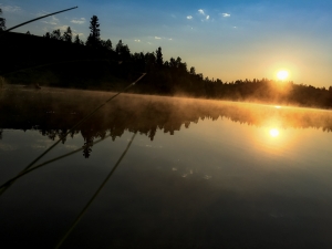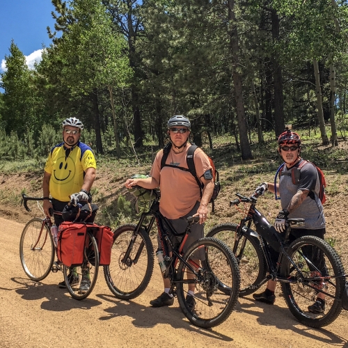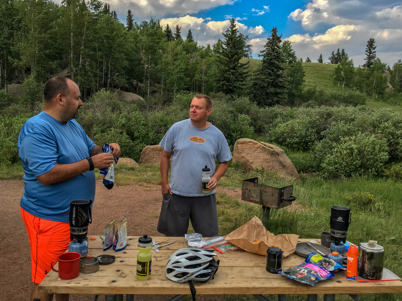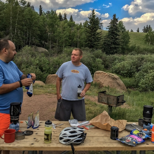 Mornings in the mountains are crisp and dry, and the mist on the lake as the sun rose was absolutely breathtaking! Breakfast was simple, packing was quick, and we were on our way out. This leg of the trip was over 40 miles in length. While we started at 9,100 feet or so, we climbed up to 9,400 feet before heading down. But it was not all downhill, in all we climbed 1,500 feet during the 3,500-foot descent. Everybody thinks going downhill is easy, I’m telling you it’s not. There is a lot of work to be had, especially with an additional 25 pounds of trailer and gear chasing your ass behind you.