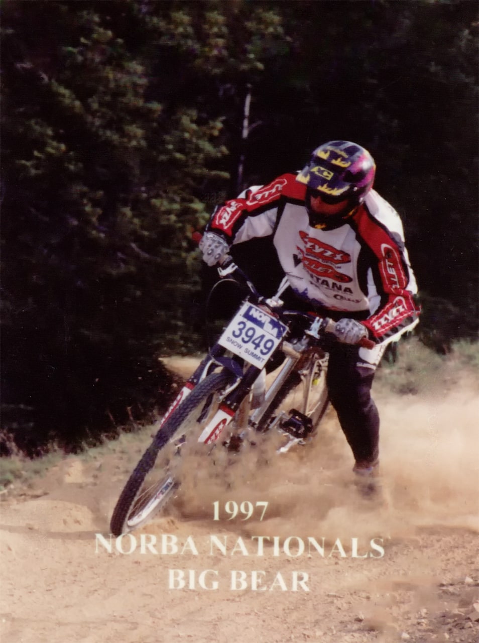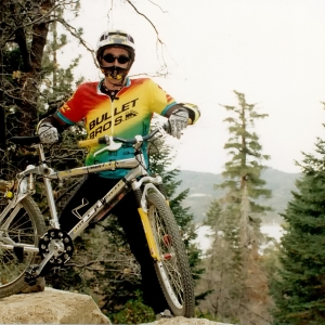 I got the nod form Singletracks.com for a photo of me from the 90s – this is form the 1997 NORBA Nationals Big Bear Lake, CA. I took 3rd at this race. Now I’m 51 and still just as hard on the trails as I was back then. But a wee bit slower, ha! I was sponsored by GT Bicycles, Bullet USA and Qranc USA to name a few. The ZZYZX Fork was one of the first tripple-clamp forks on the market and made by Dan Hanebrink – this was an amazing time to be Downhill Racing!